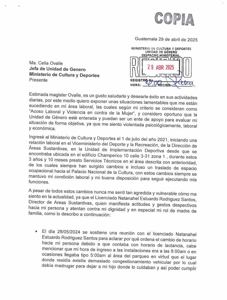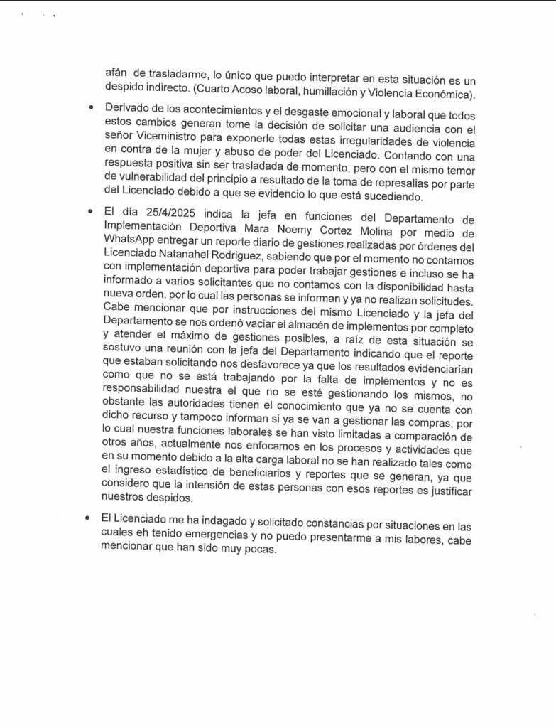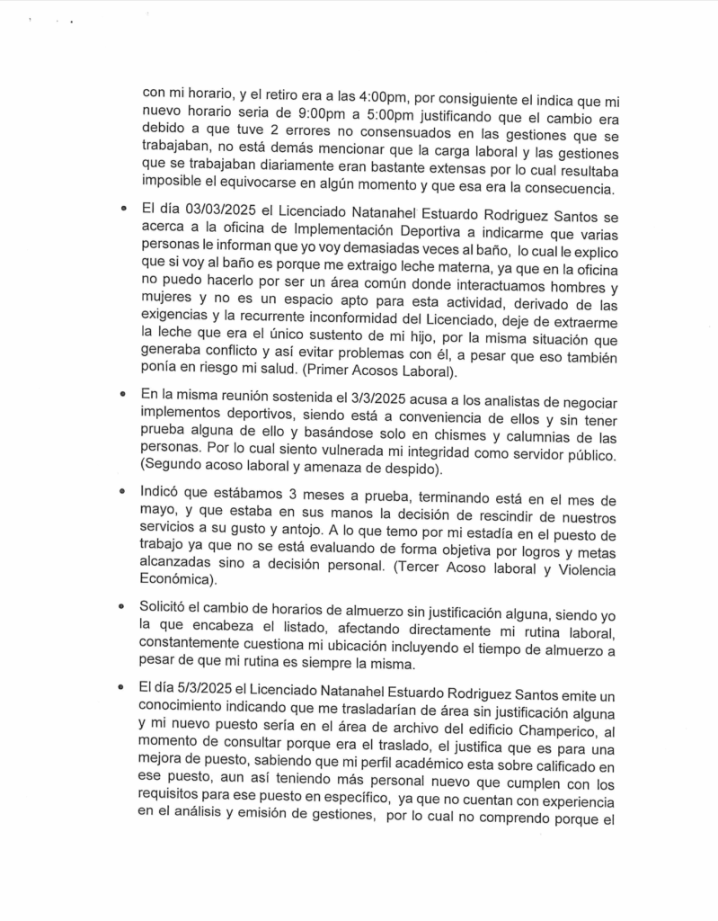 Barrales asegura que “el día 03/03/2025 el Licenciado Natanahel Estuardo Rodriguez Santos se acerca a la oficina de Implementación Deportiva a indicarle que varias personas le informan que ella iba demasiadas veces al baño, lo cual le explicó que si iba al baño es porque se extraía leche materna, ya que en la oficina no podía hacerlo por ser un área común donde interactuaba con hombres y mujeres y no es un espacio apto para esta actividad, derivado de las exigencias y la recurrente inconformidad del Licenciado, dejó de extraerse la leche que era el único sustento de su hijo, por la misma situación que generaba conflicto y así evitar problemas con él, a pesar que eso también ponía en riesgo su salud. (Primer Acosos Laboral).