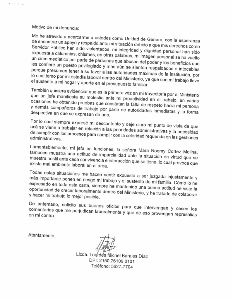 Según Barrales, labora en el Ministerio de Cultura y Deportes desde el 1 de julio del año 2021, y que desde que inició a laborar en la institución, nunca se sintió tan agredida y vulnerable cómo se siento en la actualidad, ya que el Licenciado Natanahel Estuardo Rodriguez Santos, Director de Areas Sustantivas, manifiesta actitudes y gestos despectivos hacia su persona y atentan contra su dignidad y en especial contra su rol de madre de familia, como lo describe a continuación: