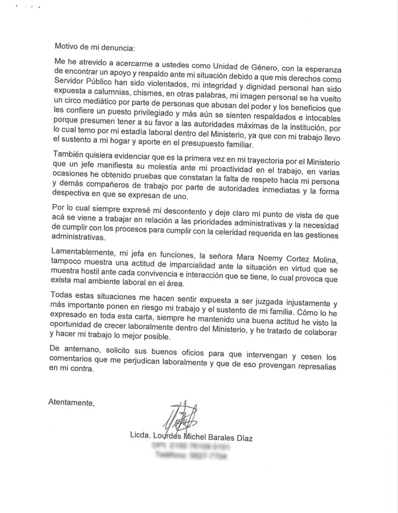 Barrales expresa que todas estas situaciones la hacen sentir expuesta a ser juzgada injustamente y más importante ponen en riesgo su trabajo y el sustento de su familia. Por lo que solicita a La Unidad de Género del Ministerio de Cultura y Deportes, una estricta investigación y le garanticen sus derechos como mujer y madre, tomando en cuenta que esta unidad fue creada para promover la igualdad de género, la equidad y la no discriminación en el ámbito cultural y deportivo de esta institución.