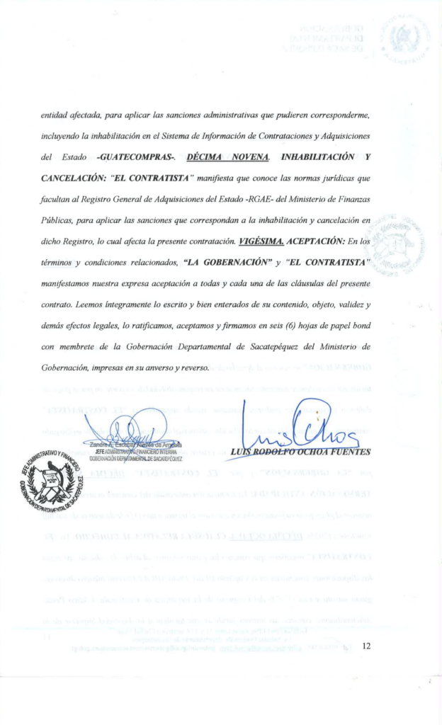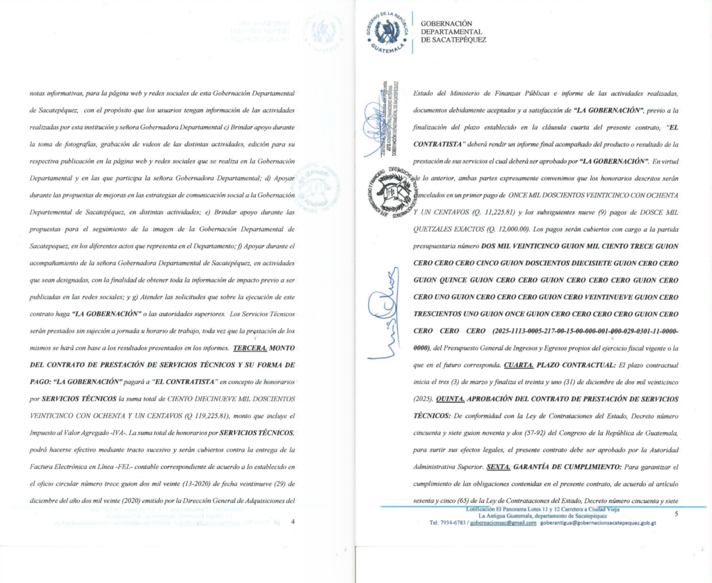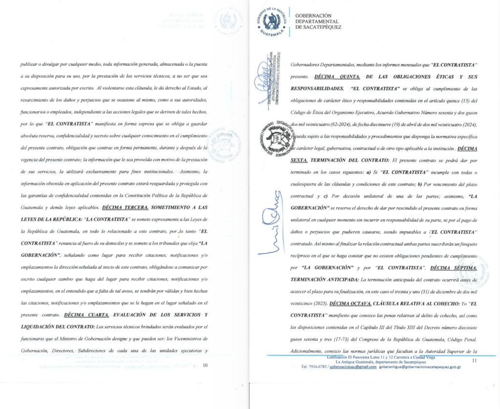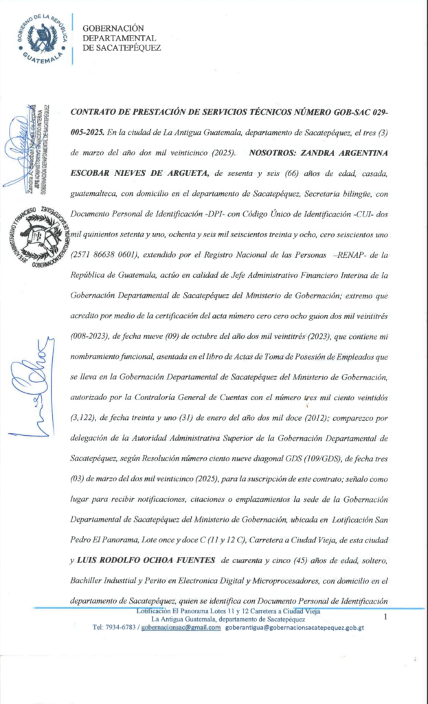 Según consta en el contrato que les presentamos a continuación, Luis Ochoa Fuentes, la mano derecha de la gobernadora Angelina Aspuac, gana Q12,000.00 mensuales, siendo Bachiller Industtial y Perito en Electronica Digital y Microprocesadores, por “Brindar apoyo durante la publicación de las actividades que se realicen en la Gobernación Departamental de Sacatepéquez, en los diferentes medios de comunicación, pagína web y redes sociales, con la finalidad de que sean de conocimiento público”, entre otras funciones de COMJNICACIÓN.