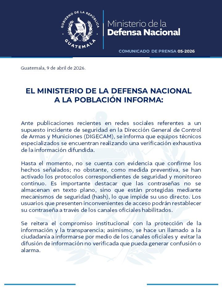 Plataforma de inteligencia de ciberamenazas VECERT Analyzer, denuncia una intrusión crítica en los sistemas de la Dirección General de Control de Armas y Municiones (DIGECAM), una agencia bajo el Ministerio de la Defensa de Guatemala. El ataque resultó en la toma de control de cuentas de usuarios y la extracción de la base de datos nacional de armas de fuego legales.